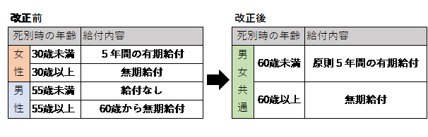 今回の改正では、この男女差が解消され、子のない配偶者については男女ともに、被保険者等との死別時点で60歳未満であれば原則5年間の有期給付、60歳以上であれば無期給付が支給されることとなります(【図表2】参照)。