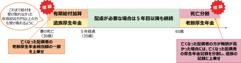 この改正に伴い、遺族となる配偶者の収入要件(年収850万円未満であること)の廃止、死亡した被保険者等の老齢厚生年金相当額の一部を遺族厚生年金に上乗せする「有期給付加算」の創設、婚姻期間中の厚生年金記録を分割して遺族の記録に上乗せして老齢厚生年金を増加させる「死亡分割」の創設、収入が十分でない等配慮が必要な場合の5年目以降の給付継続等の配慮措置が実施されます。