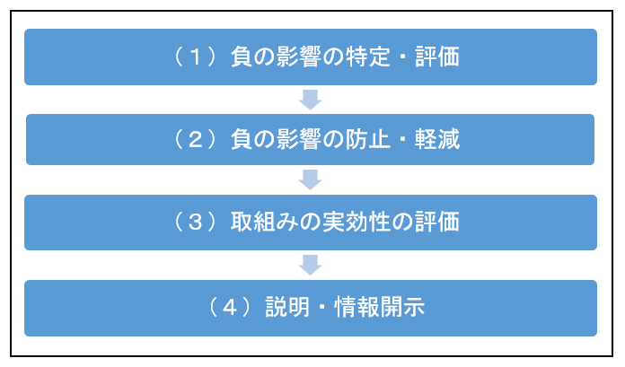 (1)負の影響の特定・評価 (2)負の影響の防止・軽減 (3)取組みの実効性の評価 (4)説明・情報開示 |