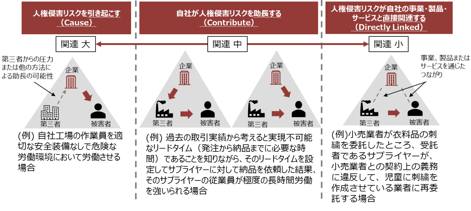 企業活動の人権への「負の影響」の範囲は3類型あるとされており、これらを人権DDの対象とすることが求められています。それぞれの具体的な類型と例は、以下の図表4のとおりです。